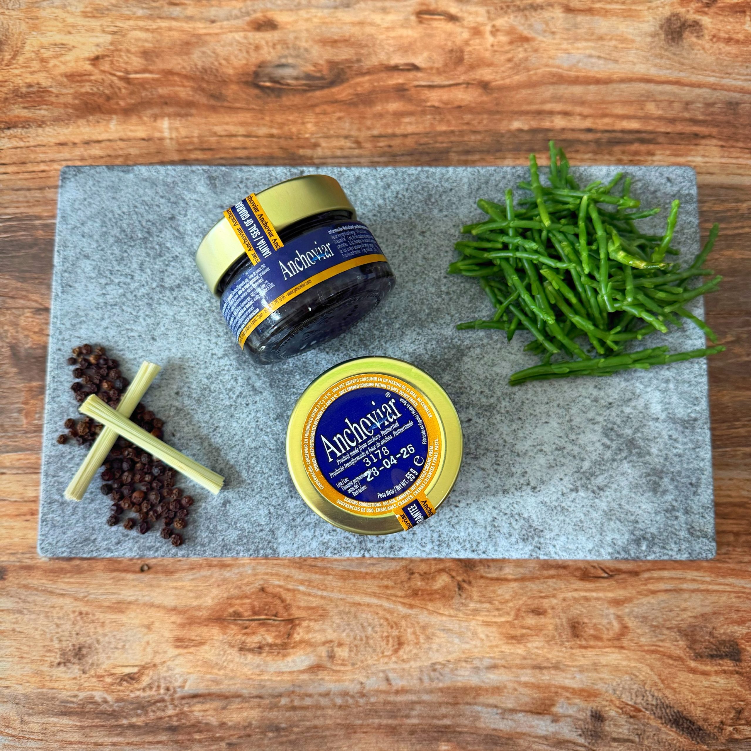 These pearls are made with anchovies from the Cantabrian Sea, which give them their pleasant and intense marine flavour. They are 2mm diameter pearls, with a creamy texture and black colour.